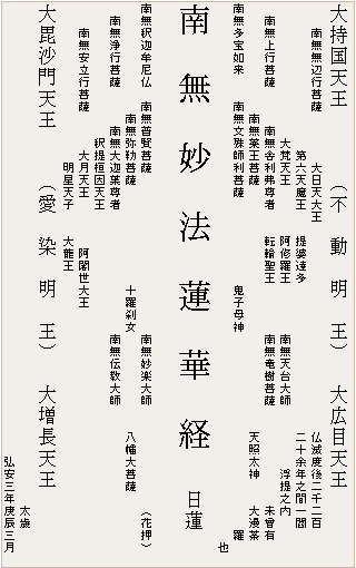 日蓮宗ではこの本尊を表現する形態として、三つの様式がとられてきました。一つは、このペ−ジの上にある大曼荼羅という形式です。二つは、一塔両尊四士といって、真ん中の宝塔には、南無妙法蓮華経と書かれ、向かって左に釈迦如来、右に多宝如来が一つの蓮台に乗っていて、右に上行、無辺行のそれぞれの菩薩が、また左に浄行、安立行のぞれぞれ菩薩が奉安される形式です。また、これには文殊・普賢・四天王・不動・愛染の諸尊も添えられる場合があります。三つめは、一尊四士といって、真ん中に釈尊像を、向かって右脇に上行、無辺行の菩薩、左脇に浄行、安立行の菩薩を奉安する形式です。この三つの形式のいずれの場合にも、その前の中心線上に日蓮大聖人の御尊像と法華経八巻を乗せた経机が奉られています。もちろん、大聖人の御尊像は御本尊でないのは言うまでもありません。本化上行菩薩応現の大聖人の教えを通して御本尊を観なければならないということです。