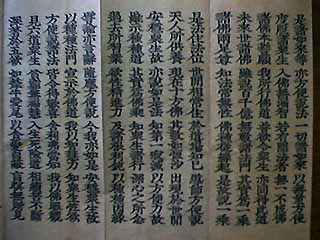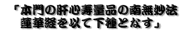 さてさて、お話が長くなりましたが、「おこない」の方法としては、受持とはお題目を身・口・意に唱えるということです。これは、正行(しょうぎょう)といって最も大事な修行です。また、実際にお経本で法華経を読む(読)、暗記した法華経を唱える(誦・じゅ)、法華経の解説書を読書する(解説・げせつ)、法華経を写経する(書写)の五つの正行を助ける助行があります。このホームペ−ジを見て、すこだけ信じてみようと思ったあなたに、もっと具体的な修行方法をお説きしましょう。ご本尊もない、寺にも行きたくないあなたにとっておきの実践方法をお教えします。それは手は合掌し、口にお題目をかすかにでも唱え、心に次の五つのことを念じるのです。もちろん、恥ずかしければ誰も見ていない時に行なったらいいでしょう。例えば、風呂の中とかベットの上でもいいです。あるいはトイレの中でもかまいません。重要なことは次の五つのことを念じて唱えるのです。