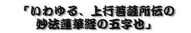 このお言葉は、『法華取要抄』という書物の中で述べられています。日蓮大聖人といえば南無妙法蓮華経、南無妙法蓮華経といえば日蓮大聖人といわれるぐらいお題目と大聖人とは切っても切り離せない関係です。つまり、宇宙全体の一切の教えというものは、妙法蓮華経の五字に集約される、あるいは妙法蓮華経の五字として絞り出されるといえるでしょう。もちろんお題目といってもお経のタイトルという意味ではないし、「ミョウホウレンゲキョウ」という発音でもないのです。どうしても「妙法蓮華経」という漢字でなければならないのです。